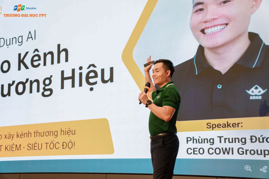 Đặc biệt, sự kiện có sự đồng hành của anh Phùng Trung Đức – Giám đốc Công ty Cổ phần Công nghệ & Truyền thông Cowi Group, một cái tên quen thuộc trong lĩnh vực MMO và Digital Marketing Global với hơn 8 năm kinh nghiệm. Với phong cách chia sẻ gần gũi, thực tế và cập nhật, anh Đức đã mang đến cho sinh viên những kiến thức thiết thực về xu hướng ứng dụng AI trong sáng tạo nội dung.