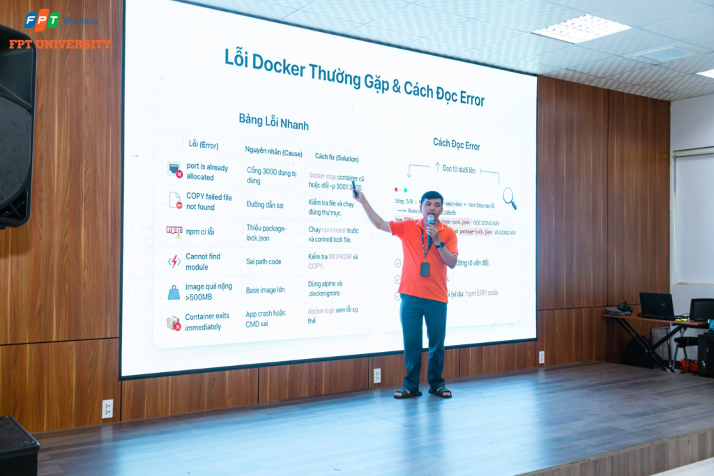 Workshop do cộng đồng học thuật tại Đại học FPT cơ sở Đà Nẵng tổ chức, với sự tham gia chia sẻ của anh Trần Đức Linh, Project Manager tại FPT Software. Chương trình được thiết kế theo hướng thực hành, giúp sinh viên từng bước chuyển đổi một dịch vụ Node.js từ môi trường phát triển cục bộ sang mô hình triển khai tiêu chuẩn trong doanh nghiệp.