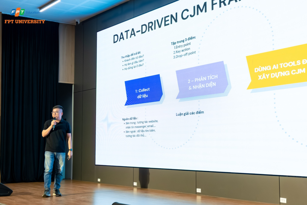 Một trong những trọng tâm của workshop là tư duy CX thế hệ mới – nơi dữ liệu không chỉ phục vụ đo lường mà trở thành đầu vào cho việc thiết kế trải nghiệm. Sinh viên được hướng dẫn cách khai thác insight từ digital data, phân tích hành vi người dùng và chuyển hóa các phát hiện này thành quyết định chiến lược trong truyền thông và bán hàng.