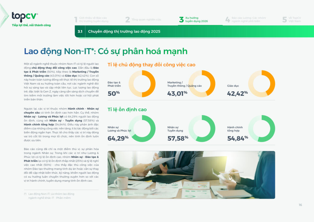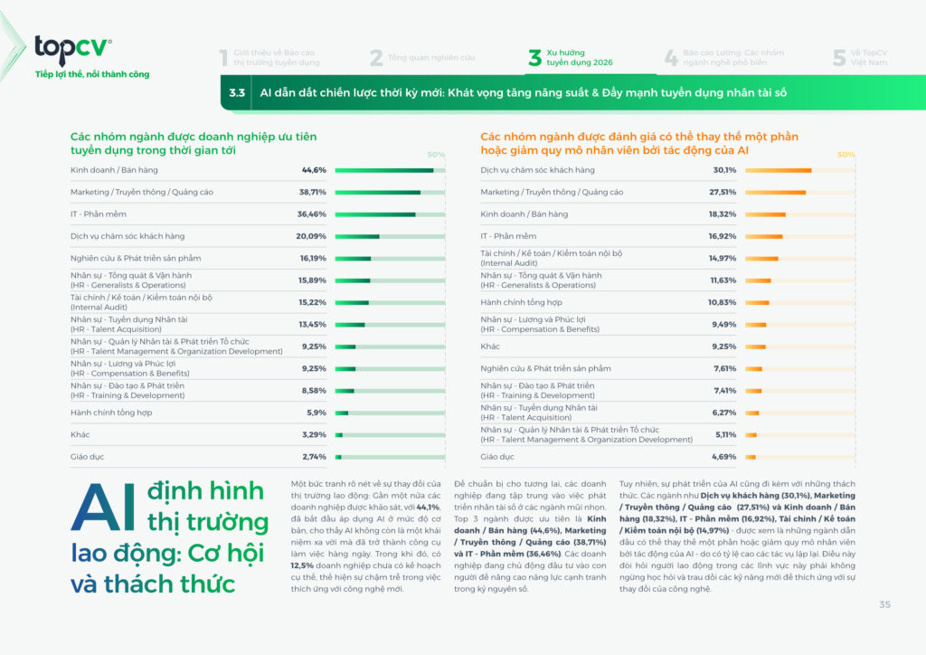 • Ngành “khát” nhân lực: Kinh doanh/Bán hàng dẫn đầu nhu cầu trong 3 năm liên tiếp, nhưng cũng là nhóm đầu tiên bị tối ưu hóa khi cần.