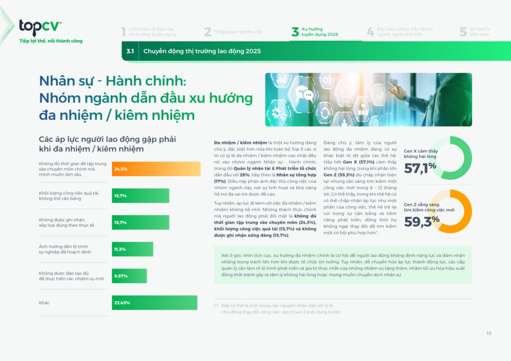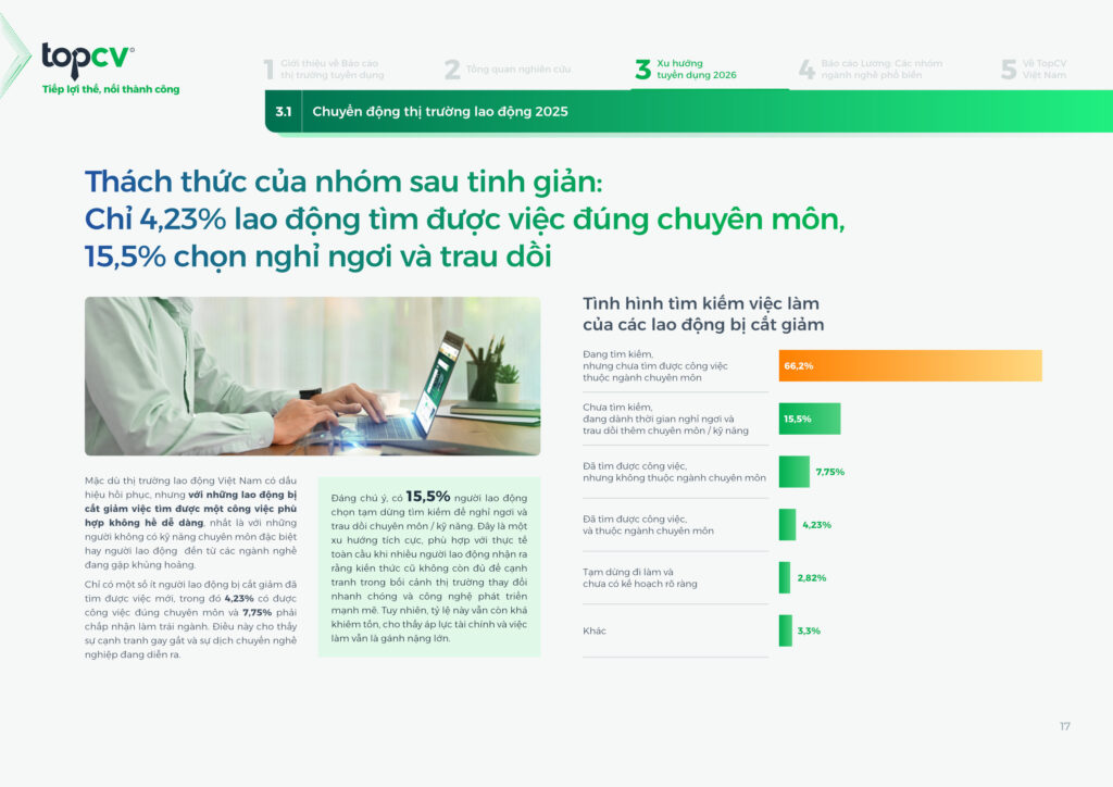 • Thực tế thu nhập: Chuyển việc không còn là “tấm vé vàng” – trung bình 26,68% người lao động chấp nhận giữ nguyên hoặc giảm đãi ngộ để tìm cơ hội mới.